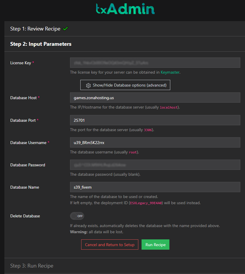 In our selection of template, it ask us to configure a database, so now we fullfill the data like this based on what is shown in the "DATABASE" of our server game panel:
