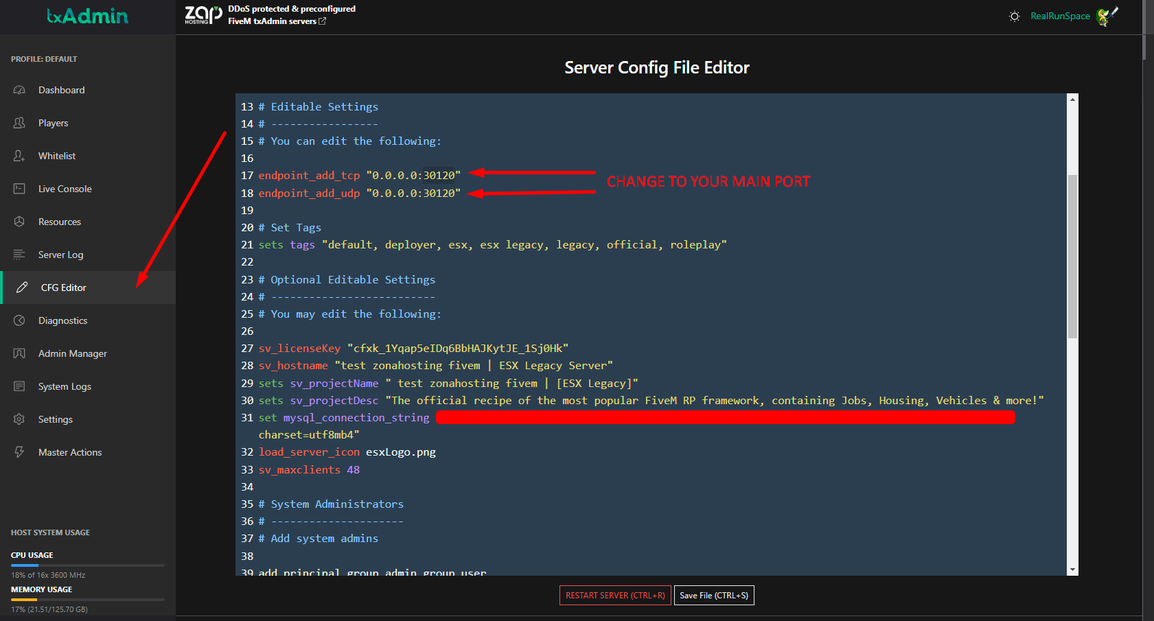 When using TxAdmin, some program files are stored in other directories and they won't use the default path, so we need to go to the TxAdmin CFG editor and change the port shown in the first two lines for the main principal server port. Now we should be able to connect to the server.
