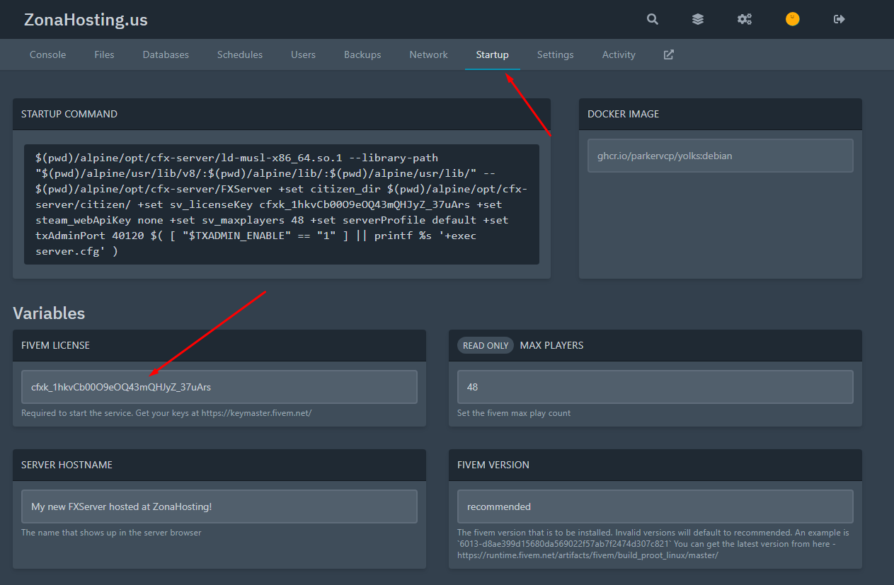 Then we copy this license to the panel. We need to go to "STARTUP" and copy it to the license field: