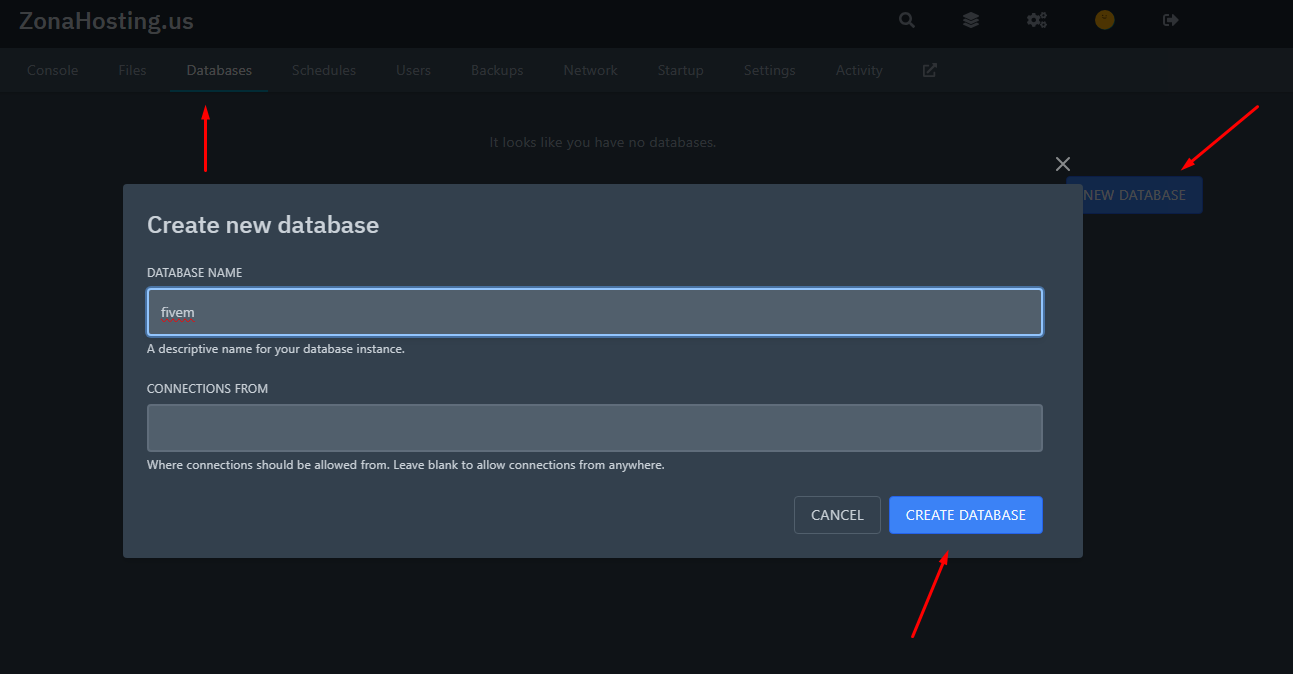 Now we go to "DATABASES" and we create a new database. We will copy the data somewhere when is created because we will use this data later: