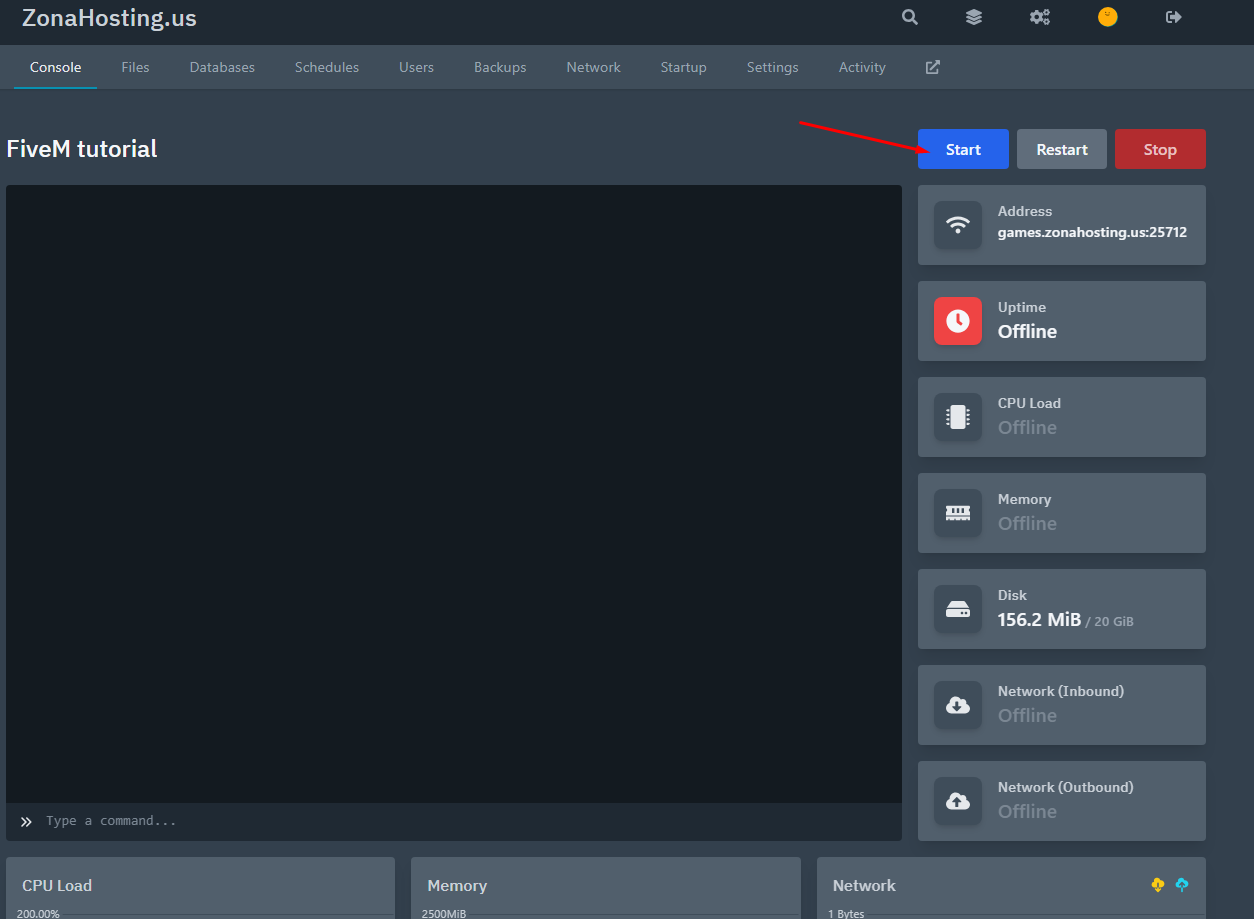 Now that we have all the database details, we go to "CONSOLE" and we hit the start button: